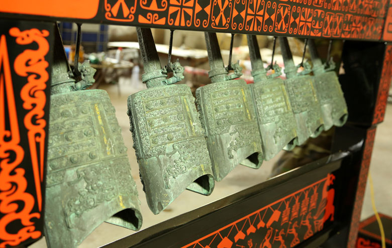 12件編鐘分2層排列,上6件下6件,編鐘為青銅鑄造,樣式可選,有長(zhǎng)枚甬鐘、短枚甬鐘、滿花紋甬鐘、有紋鈕鐘和無(wú)紋鈕鐘等多種鐘型,承托編鐘的木架采用高密度板加工,表面噴繪仿古紋飾。配套有演奏工具、收藏證書(shū)等附件。生產(chǎn)周期約10個(gè)工作日。