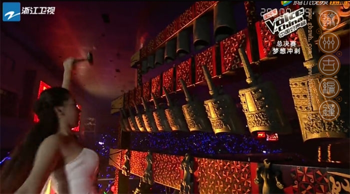 古編鐘公司受節(jié)目組委托將一套中型青銅編鐘運(yùn)達(dá)活動(dòng)現(xiàn)場(chǎng),參加好聲音北京總決賽的開(kāi)場(chǎng)部分,晚會(huì)以敲擊中國(guó)2400多年前的編鐘之聲開(kāi)場(chǎng),寓意中國(guó)文化底蘊(yùn)豐厚,好聲音自古傳今,節(jié)目由此發(fā)掘出中國(guó)眾多好聲音學(xué)員,開(kāi)創(chuàng)新一代造星之路。